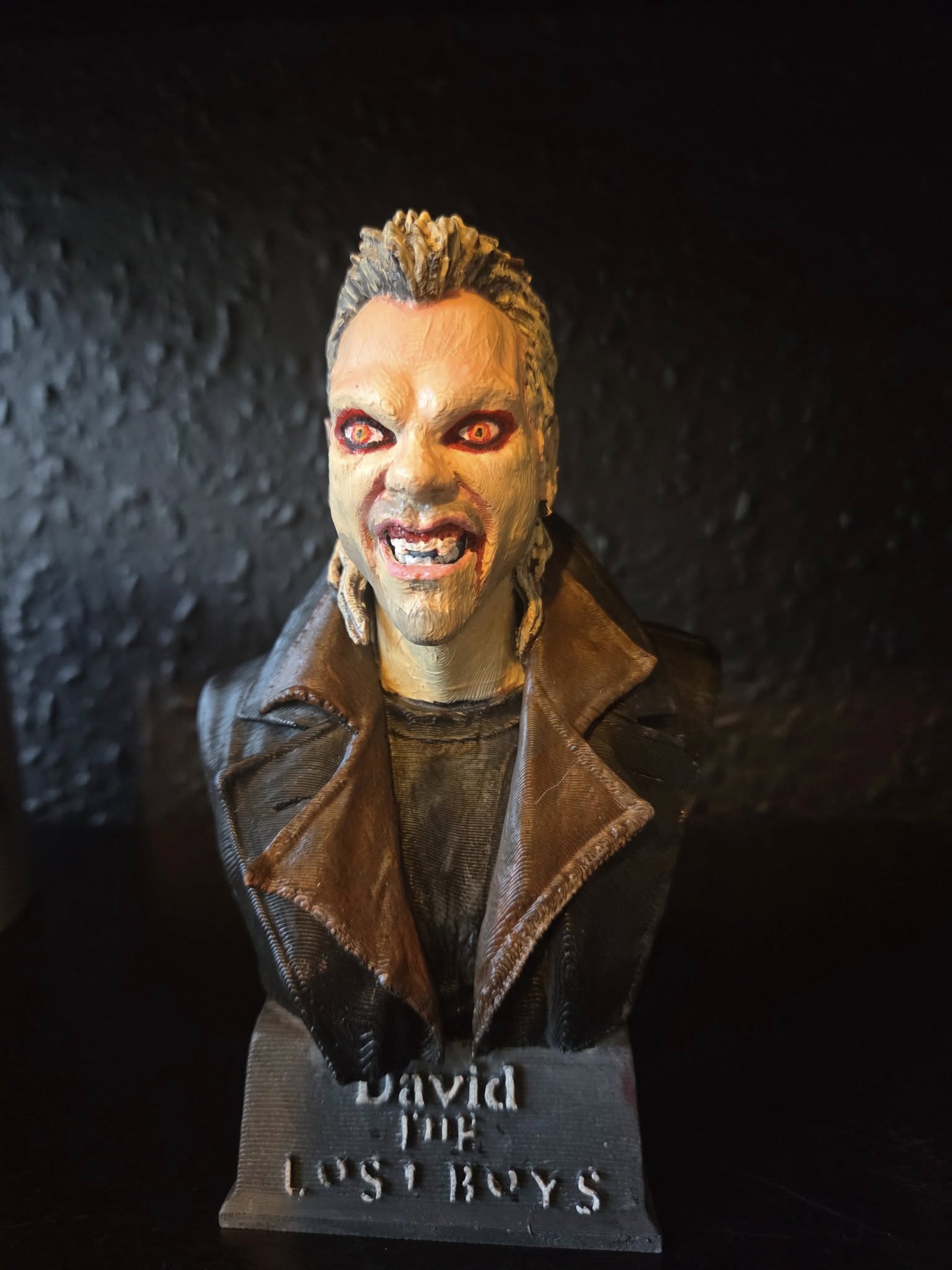 Bring the iconic vampire to life with this meticulously hand-painted David bust from "The Lost Boys." Each 3D printed model captures the rebellious charm and dangerous allure of the character with stunning detail. Perfect for collectors, horror enthusiasts, or fans of 80s cult classics. Display proudly and watch as it becomes the conversation piece of your collection.